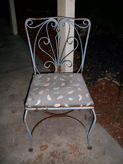 Here and here I posted a project (re-covering patio chair seats) and a hint at an upcoming project. Well today's the day! Mr. Paisley and I have stripped, wire brushed, heat gunned, scraped, cleaned, sprayed, cut, stapled, primed, and sworn...but it's done - and without injury to either of us! The vintage wrought iron patio set is now gorgeous! Thank you Mrs. Judy Alligood for giving me your mother's patio set some 12 years ago. The older I get, the more I appreciate it!